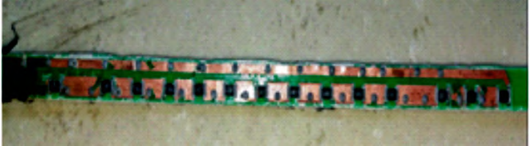 8458cc万彩网 排查PCB板是否存在短路,需要暴露出PCB板布线面,经环氧树脂溶解剂浸泡后的PCB板如图3所示,焊点光滑牢固,且未见连焊现象,可以排除PCB板短路问题。由于溶解剂对干簧管玻璃有腐蚀作用,经浸泡后的干簧管已损坏。