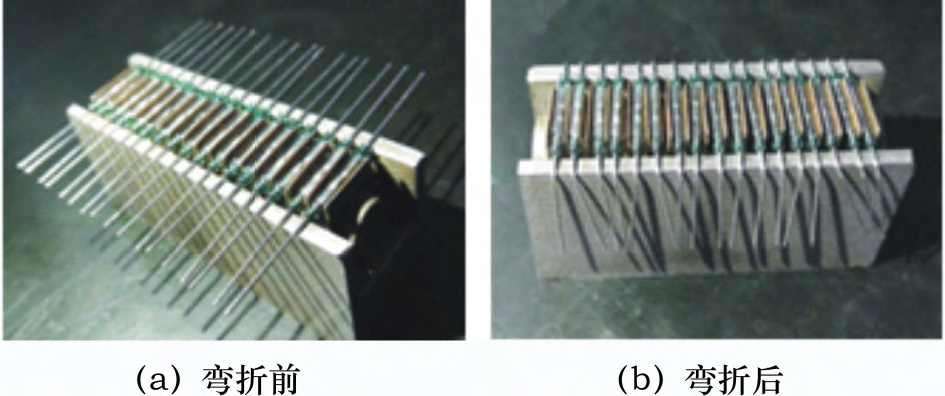 干簧管焊接前需要将其管脚由直线型弯折90°,管脚弯折后插入PCB板孔焊接,管脚弯折前后状态如图4所示。弯折管脚一般使用专用工装,工装上有凹槽并带有磁性,可以防止弯折管脚时干簧管错动,避免弯角时损坏干簧管,即使干簧管损坏,在焊接后检测时也会被发现。在生产现场排查时,随机弯折了一批干簧管,经测试,干簧管性能达标。