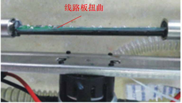 审查传感器生产记录时,发现该批故障件在生产时调整过PCB板在套管内的安装角度,此举是为了使干簧管远离泵芯一边,减小磁场对干簧管的干扰。由于调整PCB板角度时,其下部已经灌树脂,树脂已在逐渐固化,此时PCB板会受到外力扭曲,可能会造成干簧管损伤。拆解另一故障件时,发现PCB板明显扭曲变形,如图5所示,失效发生在3/4挡是因为该处的扭转变形最大。
