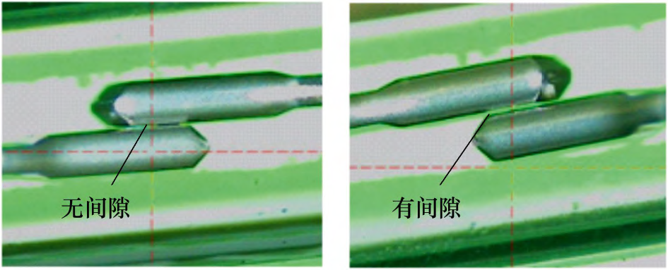 将失效的干簧管放入300倍放大仪下观察,可以看见簧片触点无间隙,而正常的簧片触点则有可见间隙,如图6所示。正常的干簧管在磁场靠近后,能观察到簧片吸合动作,而失效的干簧管则无反应。