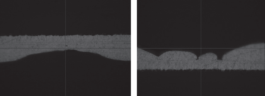 对凹坑处进行金相剖切,如图2所示,可看出凹坑处二铜电镀不全,有的甚至未镀上二铜。