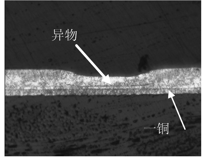 图形转移刷板的目的是去除印制板板面氧化及脏污。若刷板机对板面清洁不净,板面上的多余物会抑制二铜的电镀,形成镀铜凹坑。我研究所一段时期镀铜凹坑缺陷频繁发生,对凹坑处进行金相剖切,微蚀后可看出二铜上明显有异物阻碍了其继续电镀(如图4)。分析原因为使用的磨料刷辊式刷板机目数不合适,刷板效果差,且刷辊应用老化导致(刷板机一段目数为320目,二段为500目)。将刷板机一段更换为500目、二段更换为800目后,镀铜凹坑缺陷消失。
