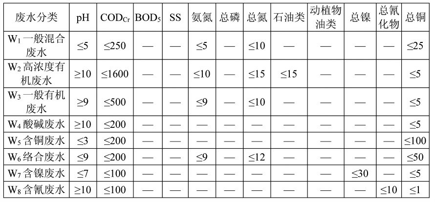 (1)一般混合废水W1:主要包括淋洗废水、纯水制备排浓水等污染物含量较低的废水。一般混合废水污染因子为pH、总铜、CODCr、氨氮等。此类废水水量较大,CODCr浓度较低。