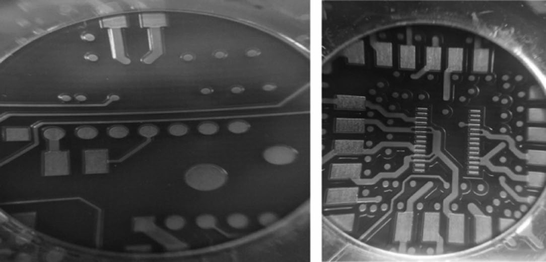 (2)最后一次阻焊制作。使用静电喷涂或喷涂工艺生产(避免喷涂时阻焊入孔),阻焊曝光时使用正常的阻焊曝光底片资料生产,阻焊完成后的效果见图1。