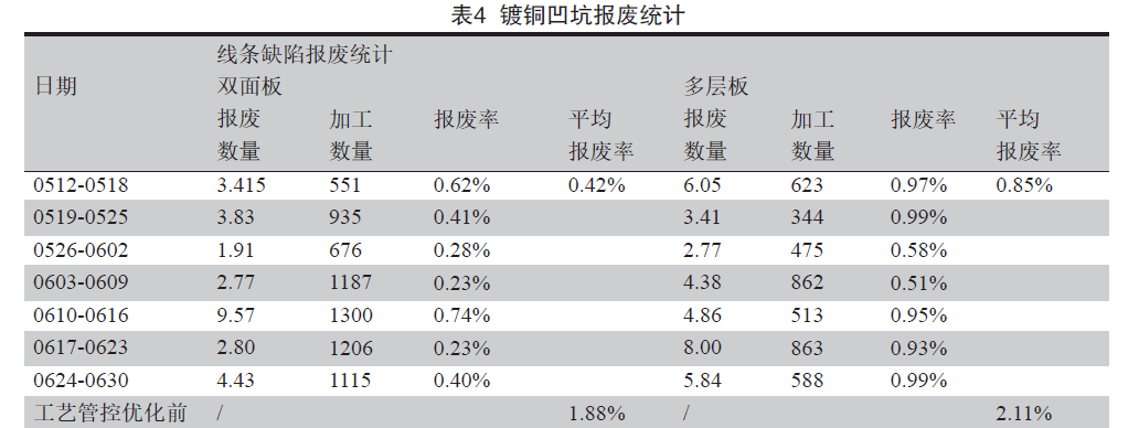 8458cc万彩网 经过对图形转移及图形电镀工序进行工艺参数的优化及生产过程严格管控后,统计现阶段镀铜凹坑报废率情况(见表4),其中双面板的报废率由之前的1.88%降至0.42%,多层板的报废率由2.11%降至0.85%。镀铜凹坑的报废数量减少3倍以上.