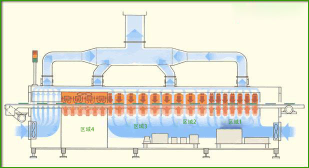 回流焊是一种焊接方法,其中将元件安装在焊点上(或以糊状形式)的电路板,或预制件),通过熔炉,焊料在熔炉中熔化并形成焊点。批处理炉(室式炉)可以一次装载一批印刷电路板。操作员将给定批次板的温度曲线输入到炉控制器中,这会根据时间改变螺旋的加热程度。烘箱气氛也得到了很好的控制,包括使用真空。回流箱式炉有利于小批量生产、试点项目以及必须仔细控制炉温分布和气氛的场合。第二种类型的熔炉内置于技术生产线中。... 带有未焊接元件的 PCB 从一端连续送入回流焊炉,并在另一端排出已经焊接的元件。因此,内置烤箱可以是普通传送带的一部分。他们从自动机器沿传送带接收付款,无需操作员干预。沿烘箱长度的各个区域的温度和传送带的速度决定了回流焊接的温度曲线。图 1 显示了一个四区回流焊炉的例子。